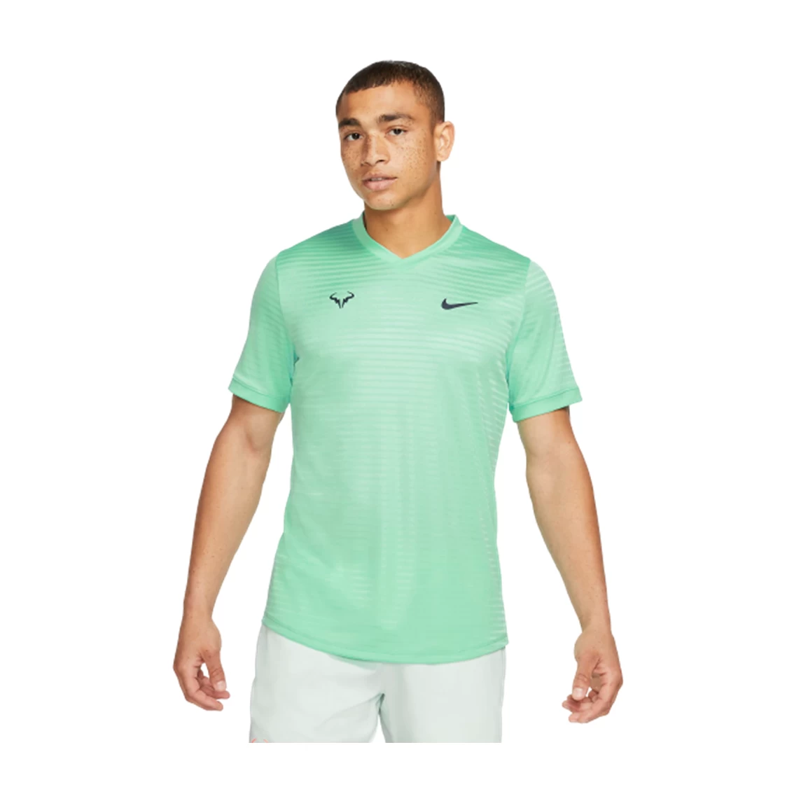 Fit-wise, the shoulder seams are rolled back at an angle so you can swing freely during overheads and the overall shape of the t-shirt is slim and tailored. Finally, it features the Nike and Rafa Bull logos on the chest.