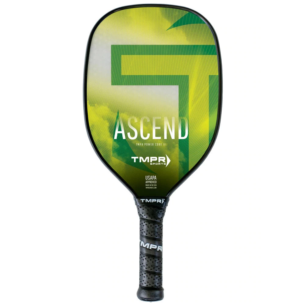 The Ascend is a medium weight power paddle. It was designed especially for players coming from tennis or racquetball backgrounds who value the aerodynamic shape, making it easier to rapidly move the paddle and add spin to the ball. Players who like to occasionally use a two-handed backhand will appreciate the extra length of the handle. It is also ideal as a singles paddle where power and speed are crucial. The Ascend features a honeycomb polymer with graphics printed directly on a fiberglass face.
